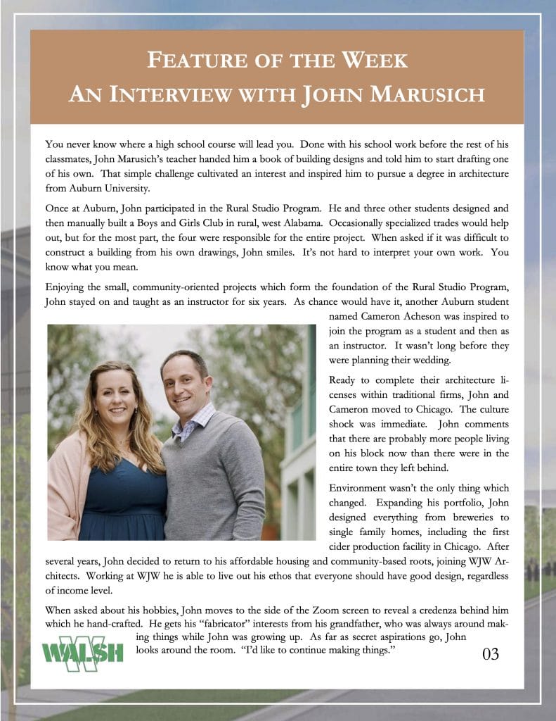 John spoke with Walsh about his background at Auburn University’s Rural Studio program and how he has been able to expand his portfolio since relocating to Chicago, where he has found a match with WJW’s commitment to making great design accessible to all.