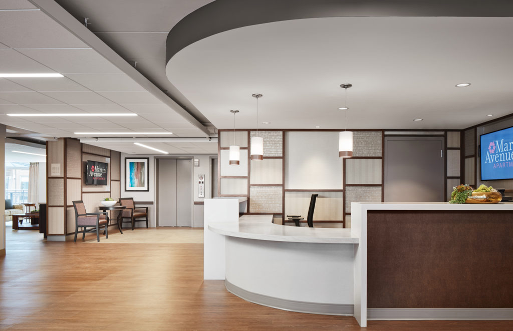 Erected in 1971, the original three-story structure was ready to be reimagined. Though the front facade offered large, floor-to-ceiling windows, the existing entry felt dark and closed off — we imagined an open, airy reception space that would offer a bright, welcoming atmosphere, with a strong connection to a new resident common area and views to the rear courtyard beyond. The design prioritizes a maximum amount of common area by better utilizing existing space, while a five-story addition increases the number of available units from 122 to 190.