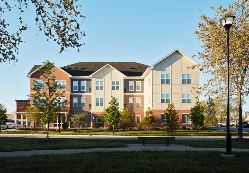 The three-story buildings, a mix of one- and three-bedroom units, can accommodate both residents and caregivers at Trinity Park Vista.