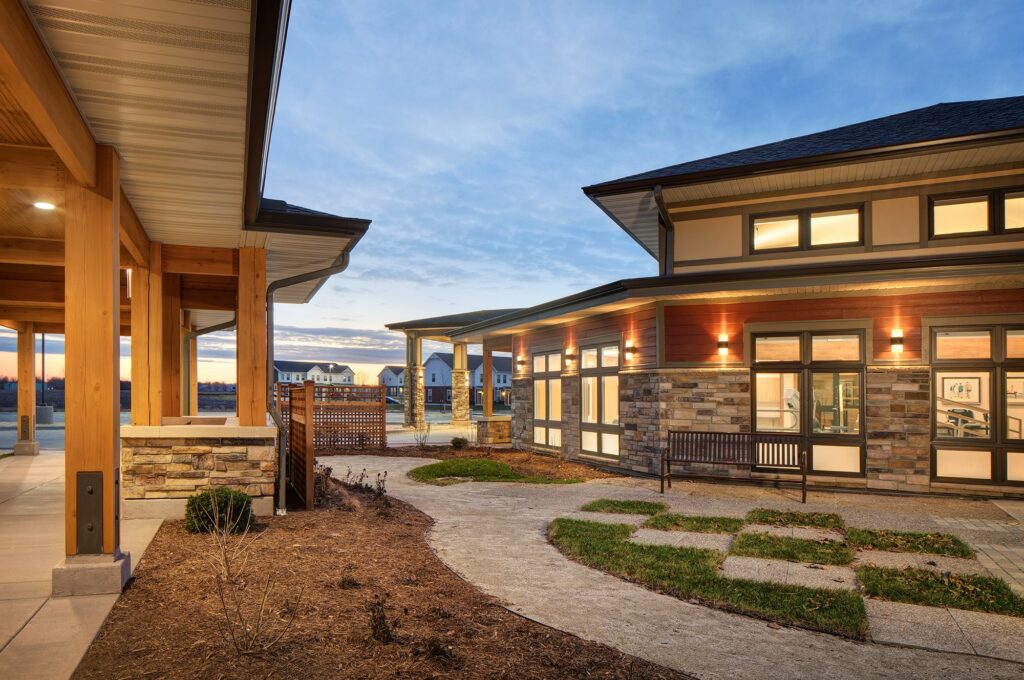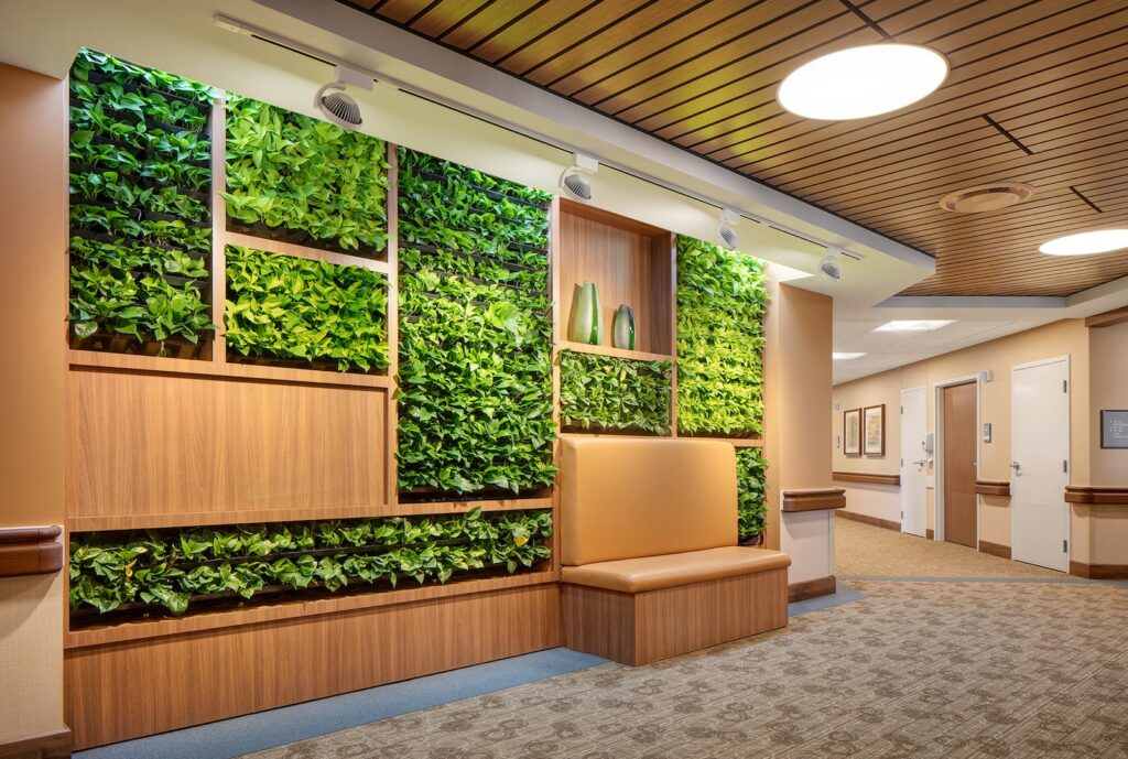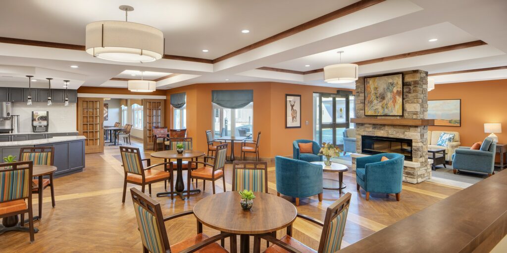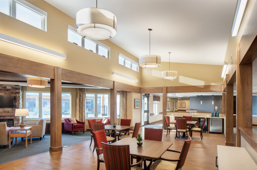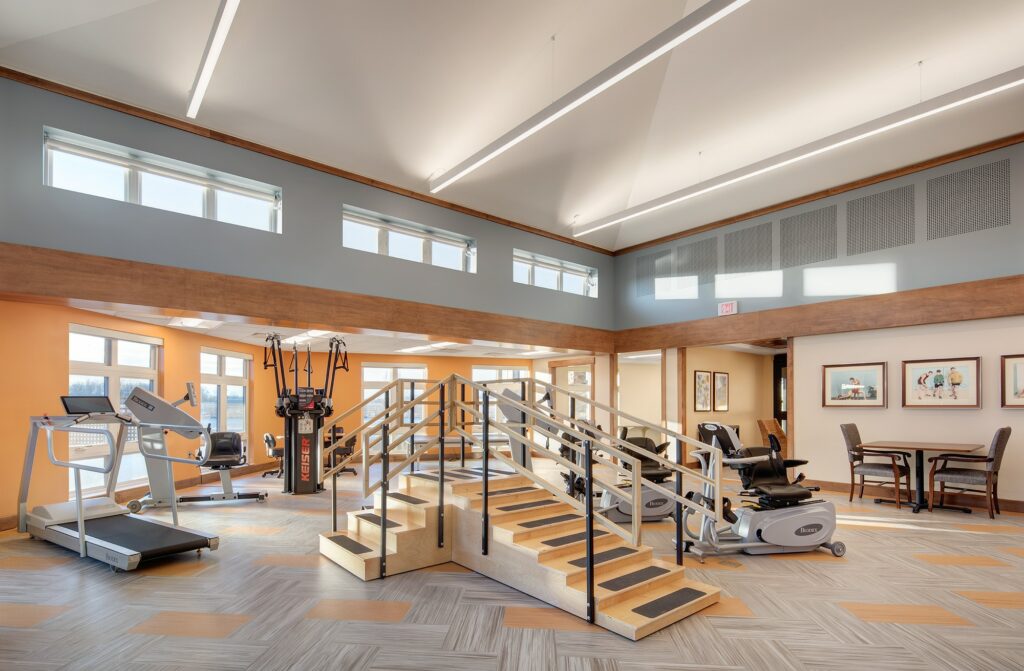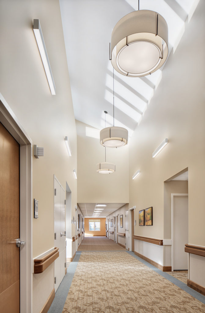 Through thoughtful collaboration, we arrived at a finished project that advances design for state-of-the-art, evidence-based care delivery in a human-centered environment. Design for both short-term patients receiving rehabilitation care and long-term residents were considered, resulting in carefully balanced, dual design approaches. Short-term care areas are designed with a nod to hospitality design, while long-term areas were created to foster a sense of a residential, home-like atmosphere. Indoor-outdoor connections are fostered throughout via inclusion of large windows in all common areas, clerestory windows that bring much-needed daylight into interior spaces — even hallways — and wings which are oriented around 5 unique exterior courtyard garden spaces connected to common areas. These strong biophilic elements are part of an overall design that takes care to foster both mental and physical wellbeing in a population that is often overlooked in skilled nursing care, building in a supportive environment, community connections and an enhanced quality of life.